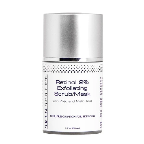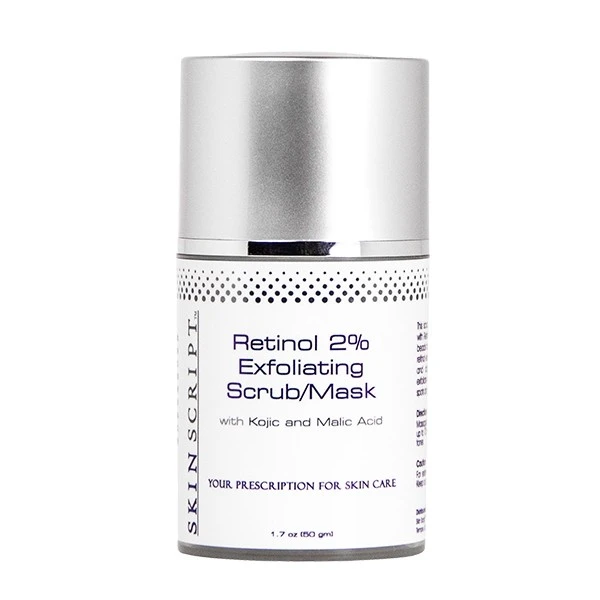 Skin Script Retinol 2% Exfoliating Scrub restores youthfulness by minimizing the appearance of wrinkles and evening out skin tone. Jojoba beads work as an exfoliant to resurface the epidermis to reveal healthy new skin. Kojic and malic acid lightens hyperpigmentation for a clearer looking complexion while retinol encourages collagen production and protects skin from environmental damage.